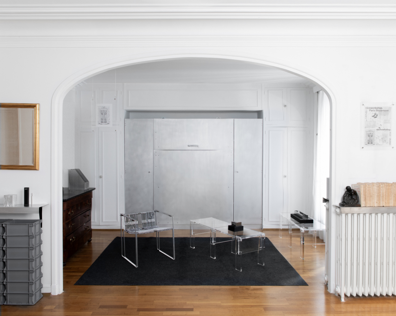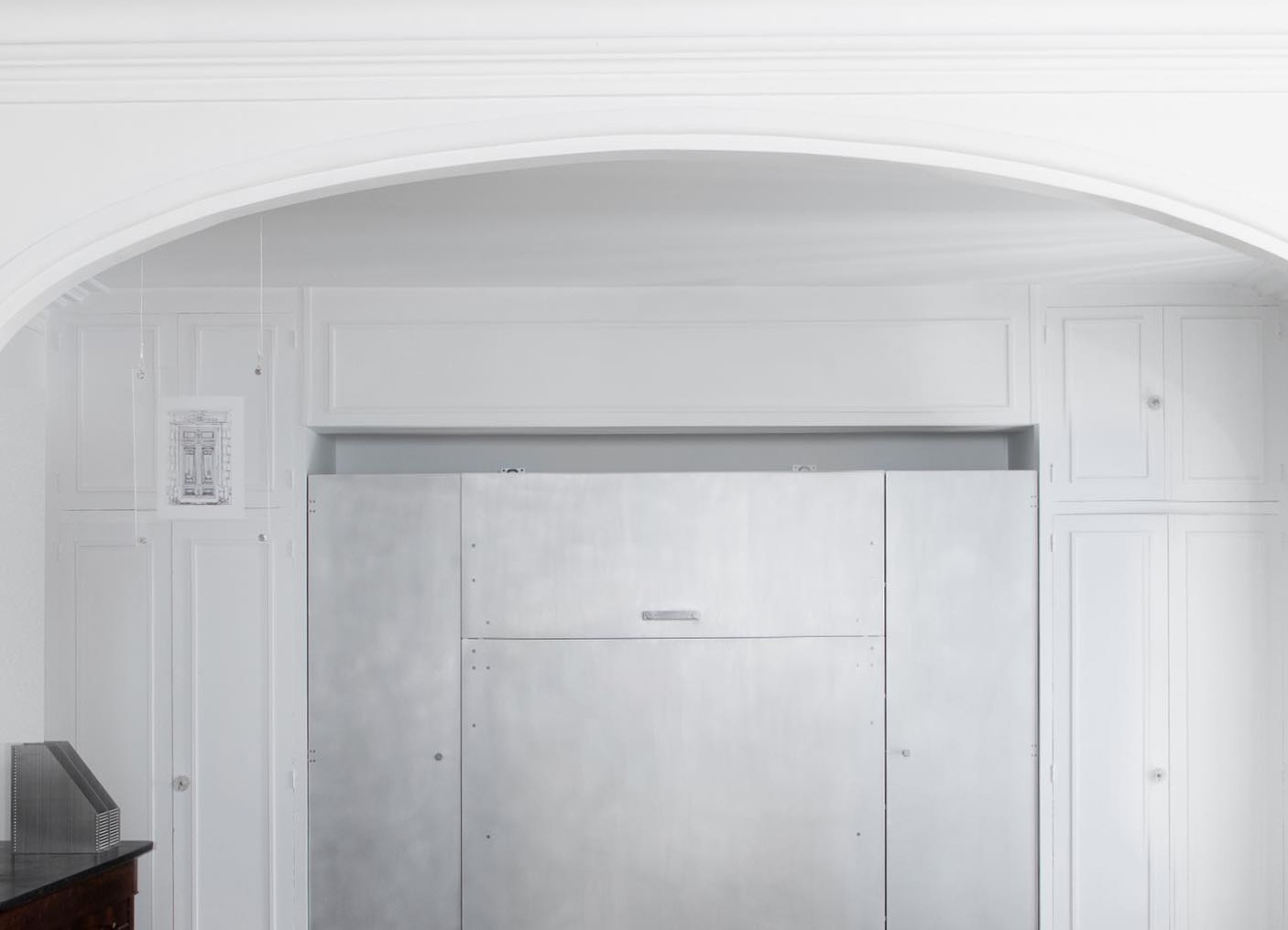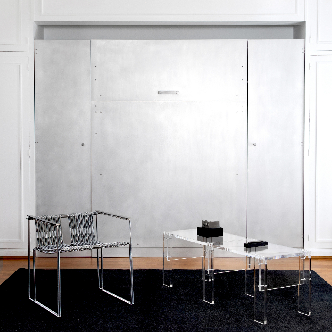 A wall-mounted foldaway bed made of 10mm aluminum sheet, featuring two integrated shelves. Designed by Niceworkshop. Produced by Perron & Frères. Installed by Perron & Frères.